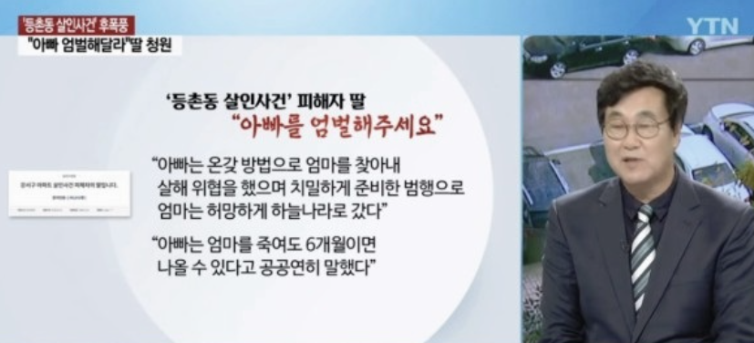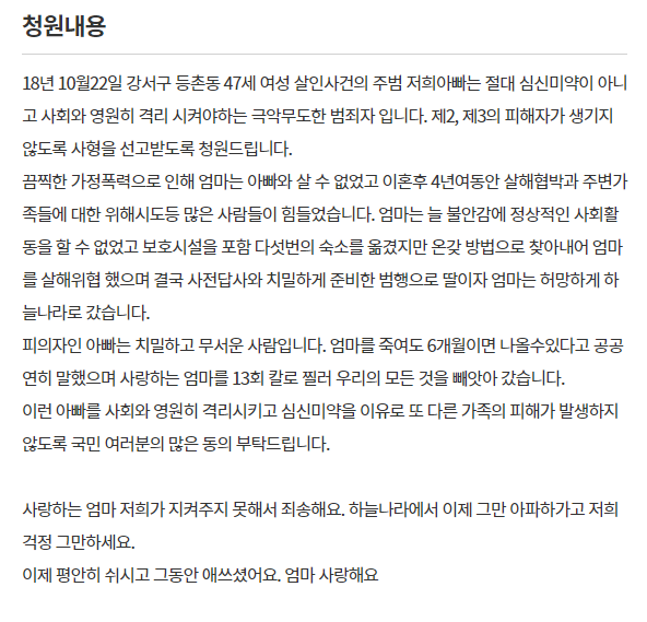 끔찍한 가정폭력으로 인해 엄마는 아빠와 살 수 없었고 이혼 후 4년여 동안 살해 협박과 주변 가족들에 대한 위해시도 등 많은 사람들이 힘들었습니다. 엄마는 늘 불안감에 정상적인 사회활동을 할 수 없었고 보호시설을 포함 다섯 번의 숙소를 옮겼지만 온갖 방법으로 찾아내어 엄마를 살해 위협했으며, 결국 사전답사와 치밀하게 준비한 범행으로 엄마는 허망하게 하늘나라로 갔습니다. 피의자인 아빠는 치밀하고 무서운 사람입니다. 엄마를 죽여도 6개월이면 나올 수 있다고 공공연히 말했으며 사랑하는 엄마를 13회 찔러 우리 모든 것을 빼앗아 갔습니다.
