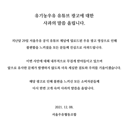 지난달 29일 서울우유 공식 유튜브 채널에 업로드된 우유광고 영상으로 인해 불편함을 느끼셨을 모든 분들께 진심으로 사과드립니다.