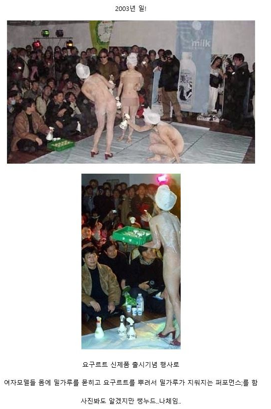 요구르트 신제품 출시 기념회인데 종로의 한 갤러리에서 여자 모델들을 동원해 온몸에 밀가루와 요구르트를 뿌려서 밀가루를 지우는 퍼포먼스를 선보였습니다. 올누드였다고 하네요... 당시 이런 행사를 진행한 서울우유 마케팅 팀장은 벌금 500만원을, 모델 3인은 각 벌금 50만원의 판결을 받았다고 합니다.
